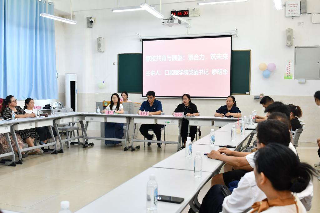当天下午,学院组织了新生家长见面会。会上,学院马卓飞副院长向家长们解读了口腔医学人才培养方案,党委副书记廖赞勇就学生的成长与学风保障进行了介绍说明,学院党委书记廖明华详细介绍了学院的发展历程与办学特色,并强调学院将坚持“以党建引领学风,以党建推动管理”的育人方针,致力于培养有理想、有担当的卓越口腔医学人才。现场气氛热烈而庄重,家长们凝神聆听、认真记录,不时点头赞同。此次会议有效凝聚了家校共识,为后续推进精细化学生管理、助力新生成长成才奠定了坚实基础。