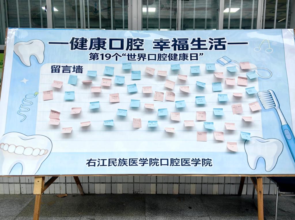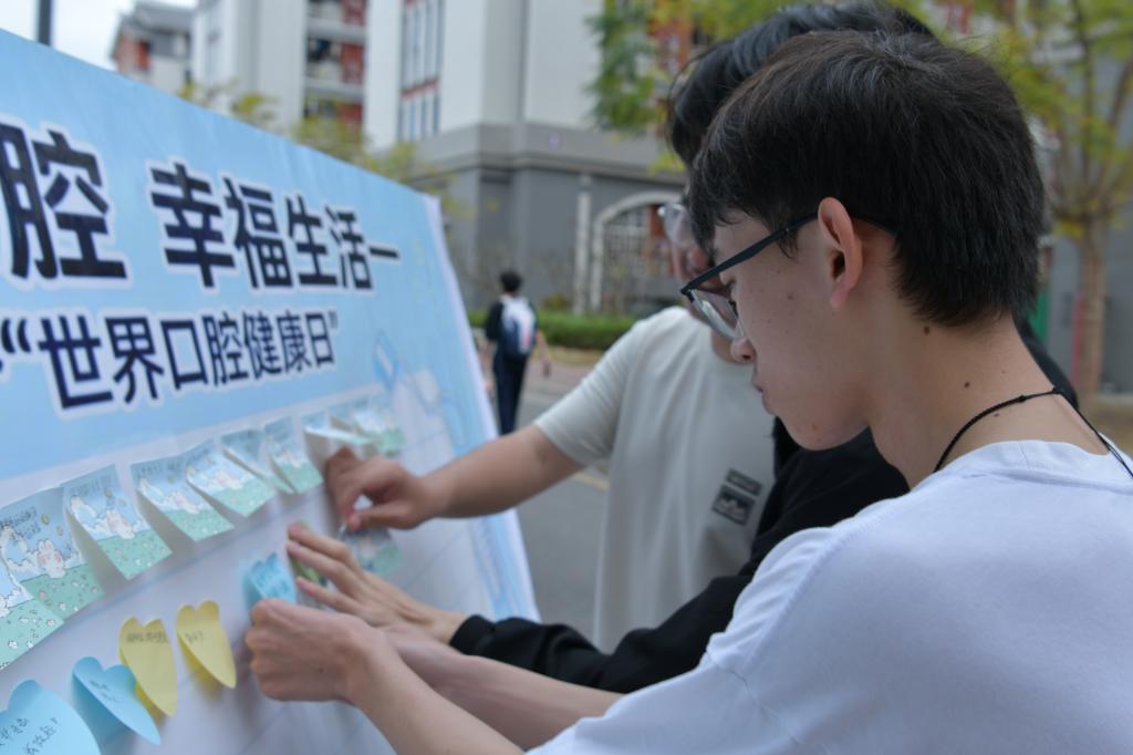 在留言墙前,师生们踊跃提笔,在便利贴上写下“爱牙护牙,志愿同行”“健康口腔,幸福常伴”等暖心寄语。贴满寄语的留言墙,不仅成为现场一道温馨的风景线,更凝聚起全校师生共同守护口腔健康的集体共识。