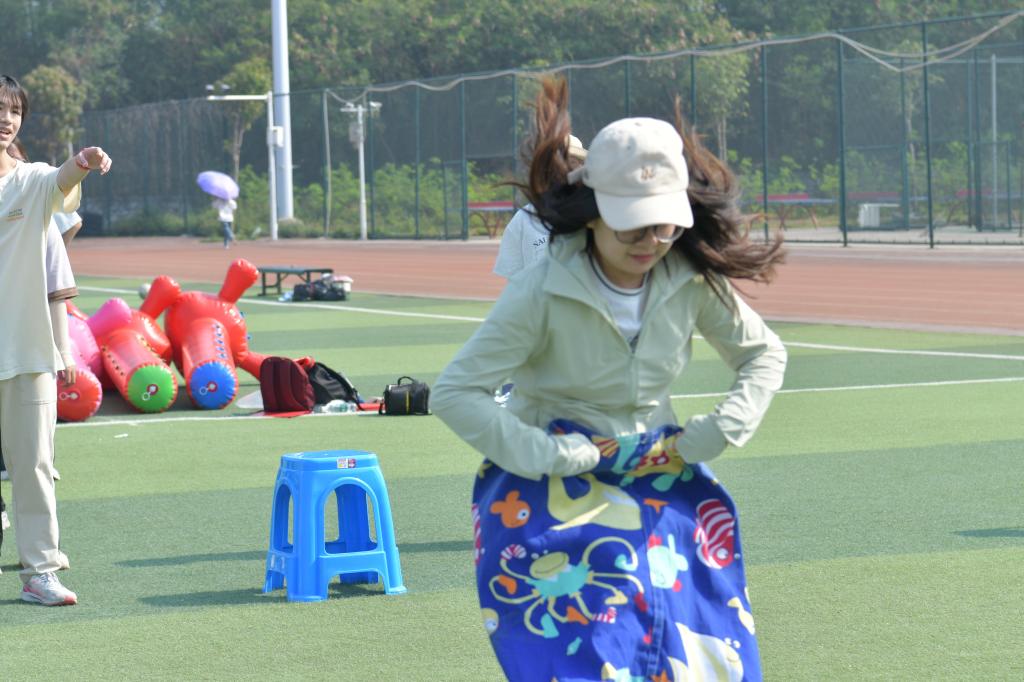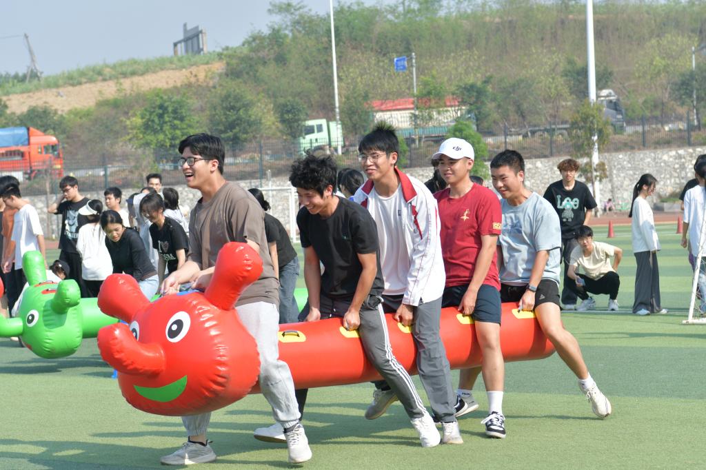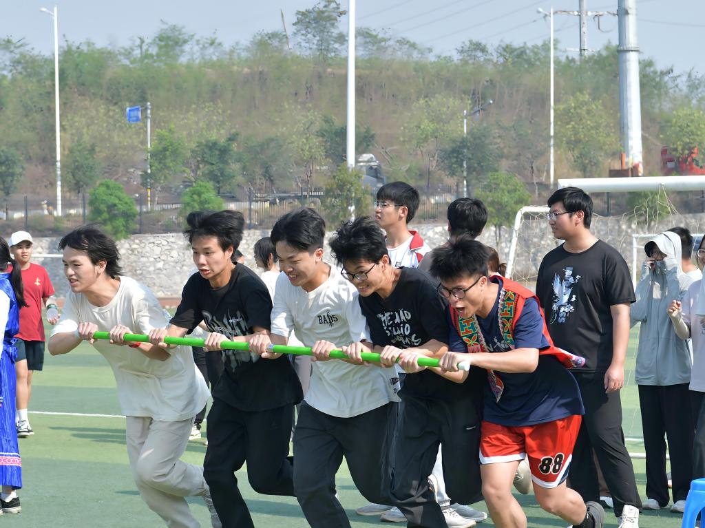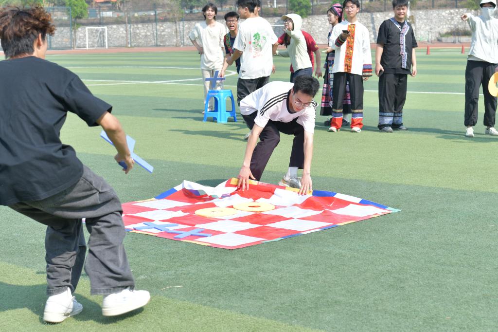 赛场上,同心竞速・共筑民族情(毛毛虫竞速)中队员们紧密相依、步调一致,彰显各民族同心同向、携手前行的团结情怀;跃动接力・共赴新征程(袋鼠跳)里大家奋勇跳跃、接力传递,展现青年学子并肩拼搏、昂扬向上的精神风貌;同心齐跑・共绘团结图(长杆旋风跑)时众人紧握长杆、协同奔跑,诠释手足相依、休戚与共的民族深情;棋聚同心・共凝民族心(趣味五子棋)对局中选手们沉着对弈、默契协作,以方寸棋盘凝聚同心同向的民族力量。每一项比赛都高潮迭起,加油声、欢笑声、喝彩声此起彼伏,现场洋溢着热烈欢快、团结奋进的浓厚氛围。